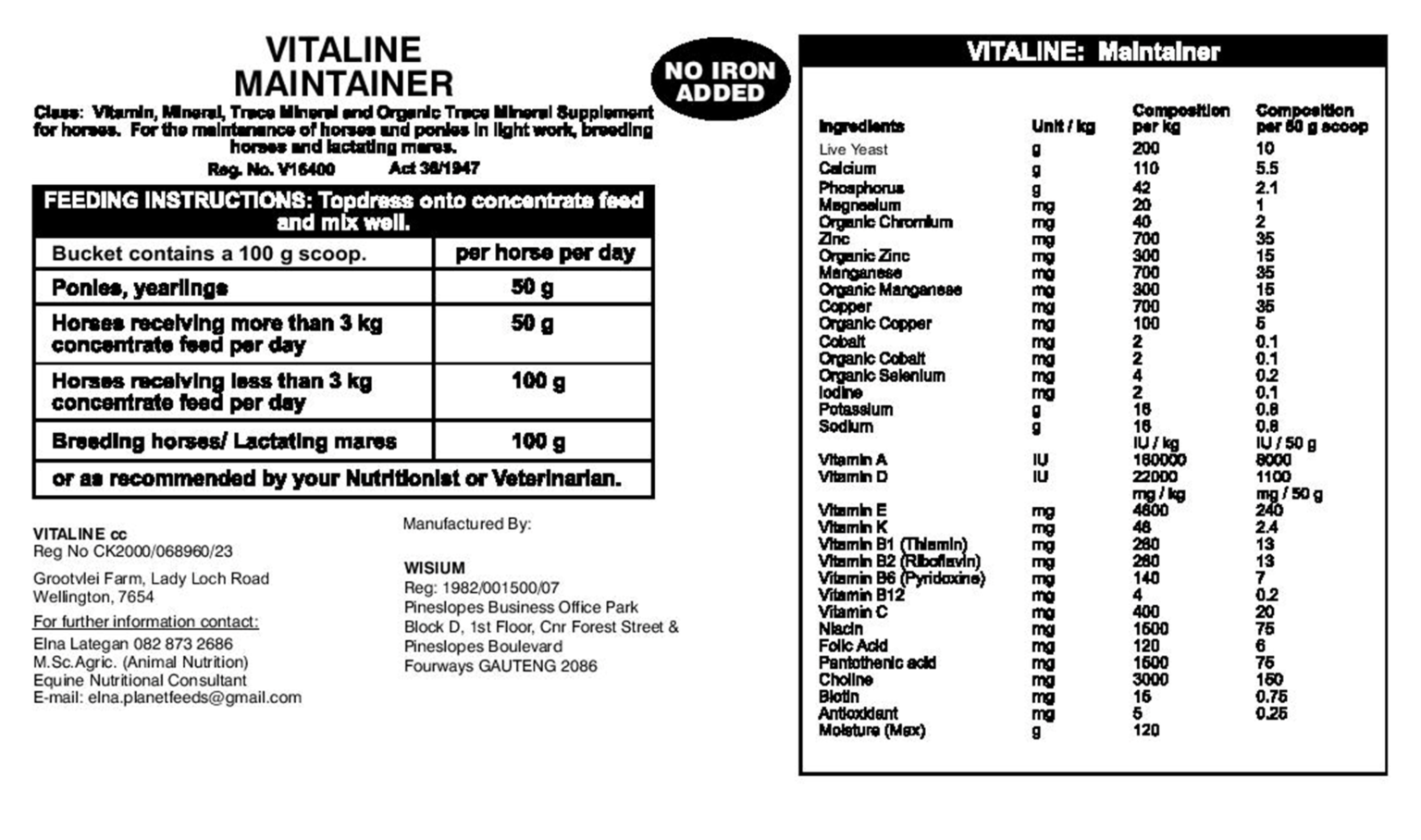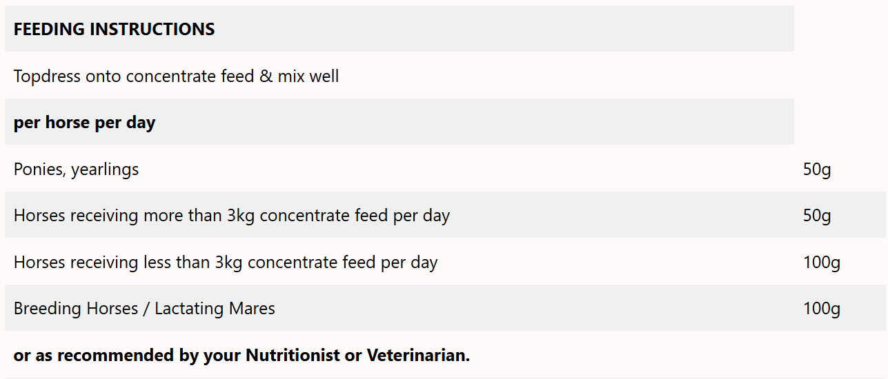Comprehensive vitamin, mineral, trace mineral, and live yeast supplement that maintains everyday vitality in ponies and horses in light work or breeding programmes.